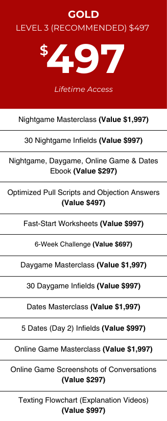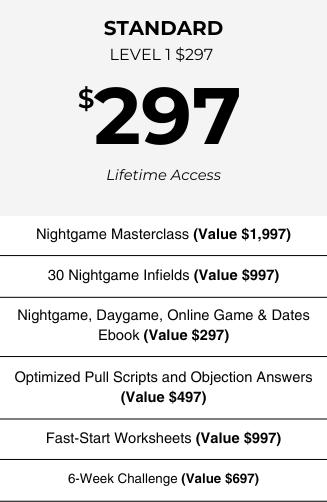 Nightgame Masterclass, 30 Nightgame Infields, All 5 Bonuses, Nightgame, Daygame, Online Game & Dates Ebooks, Optimized pull scripts and objection answers, Worksheets, 6 Week Challenge, Pre-Bootcamp Speech, Templates For Managing Leads, 30 Minute Orientation Call, and Personalized 24 Hour Support
