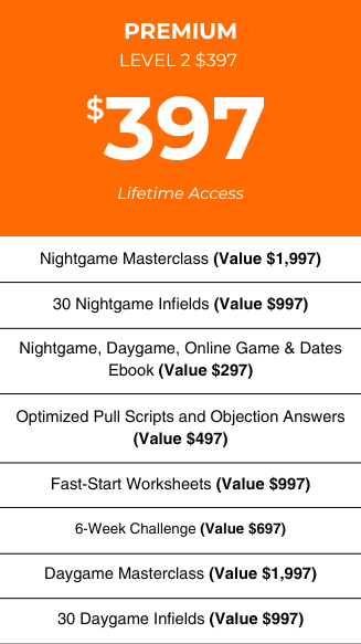We'll be covering exactly how to take her from the venue to your place. If she doesn't want to go, you'll be getting our exact steps to get her number and confirm a date that week. You'll also get the secrets to dating multiple girls and even girls that are hired for their looks.