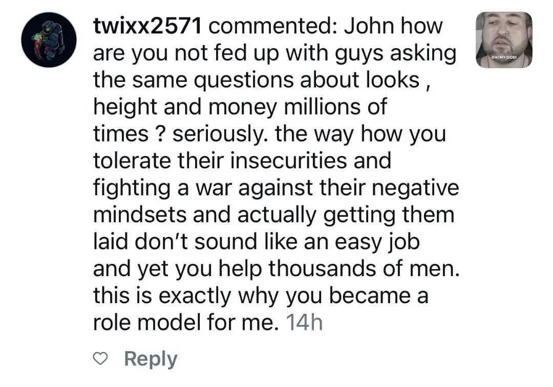 Edward wasn't a fan of John... yet. Once he got onto john's training program, within 2 weeks, he was also able to get with his 10/10 dream girl. Now, he has the skills and strategy to consistently attract 9s and 10s into his life, without overthinking.